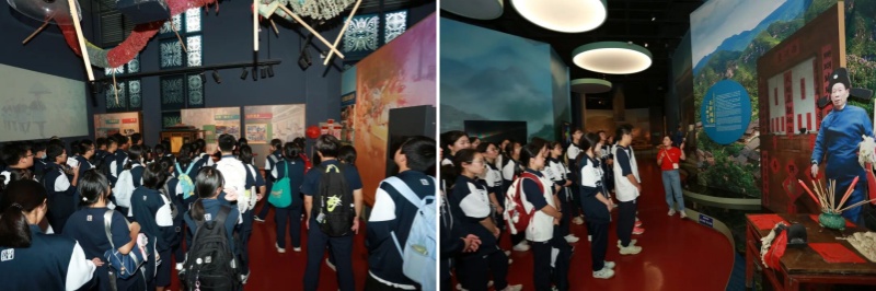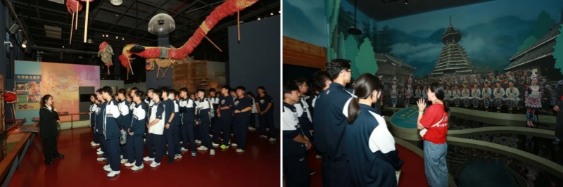 随后,师生走进文创园内的非遗博览馆。馆内以实物、模型、视频等形式,集中展示了贵州752项非物质文化遗产——苗族银饰的精美花纹、侗族大歌的音频片段、布依族蜡染的绚丽图案,全方位呈现了贵州各民族的文化瑰宝。
