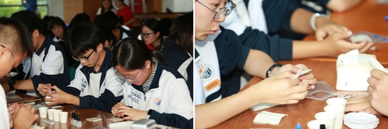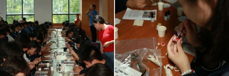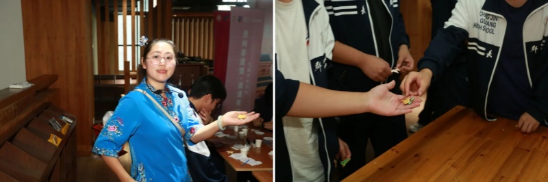 在非遗集市,同学们亲手制作通草画胸针。在非遗传承人的指导下,同学们相互帮助、协作创作,将对美好生活的向往融入小小的胸针中。大家在一笔一画中体会匠人精神的精益求精,理解了“劳动创造价值”的深刻道理。同时,在互动中增进了彼此的了解与友谊,切实体会到“中华民族一家亲”的温暖。