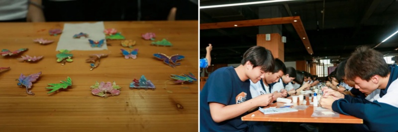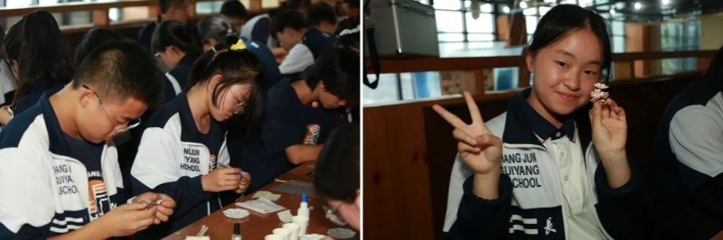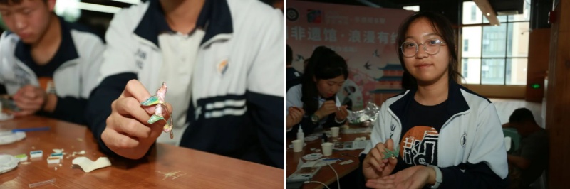 当一枚枚独一无二的通草画胸针完成时,学生们纷纷佩戴在胸前,脸上满是成就感。“原来看似简单的胸针,要这么多工序!”大家在手工体验中,不仅学会了通草画技艺,更领悟到“精益求精”的匠人精神,让非遗传承真正从“观看”变成“参与”。