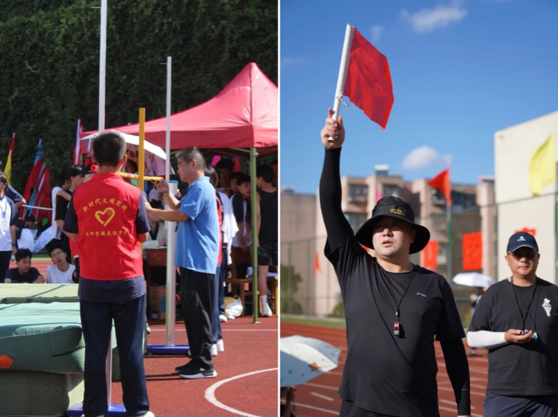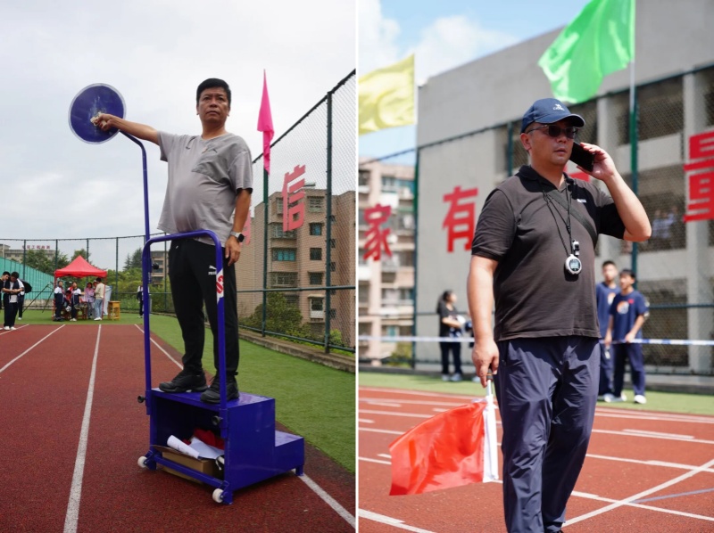 裁判老师们化身“公正的标尺”,在烈日下挺直脊背,目光如炬地紧盯赛场每一个瞬间。起点处,他们举枪的手臂稳如磐石,紧盯发令时机,确保每一次起跑都公平公正;跑道旁,计时员指尖在计时器上精准跳跃,目光紧锁冲线的身影,不错过毫秒之差;田赛场地里,测量员弯腰校准刻度,反复核对成绩,用卷尺丈量着每一份努力的距离。