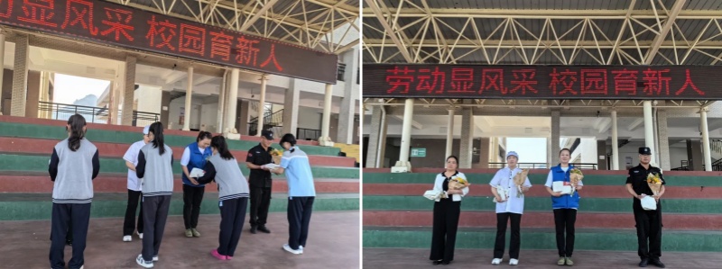 习近平总书记说过“光荣属于劳动者,幸福属于劳动者。”学校的发展离不开后勤服务团队的有力保障,在我们校园内就有一支涵盖安保人员、保洁人员、食堂工作人员、宿舍生活老师在内的可亲可敬的保障团队。杨红主任介绍了其中的优秀代表:安保人员代表杨德桥、保洁人员代表叶后英、食堂工作人员代表聂祥春、生活老师代表程春。学生代表为几位优秀的劳动者献上鲜花和在张倩老师指导下高二年级同学通过篆刻学习制作的文创手袋。